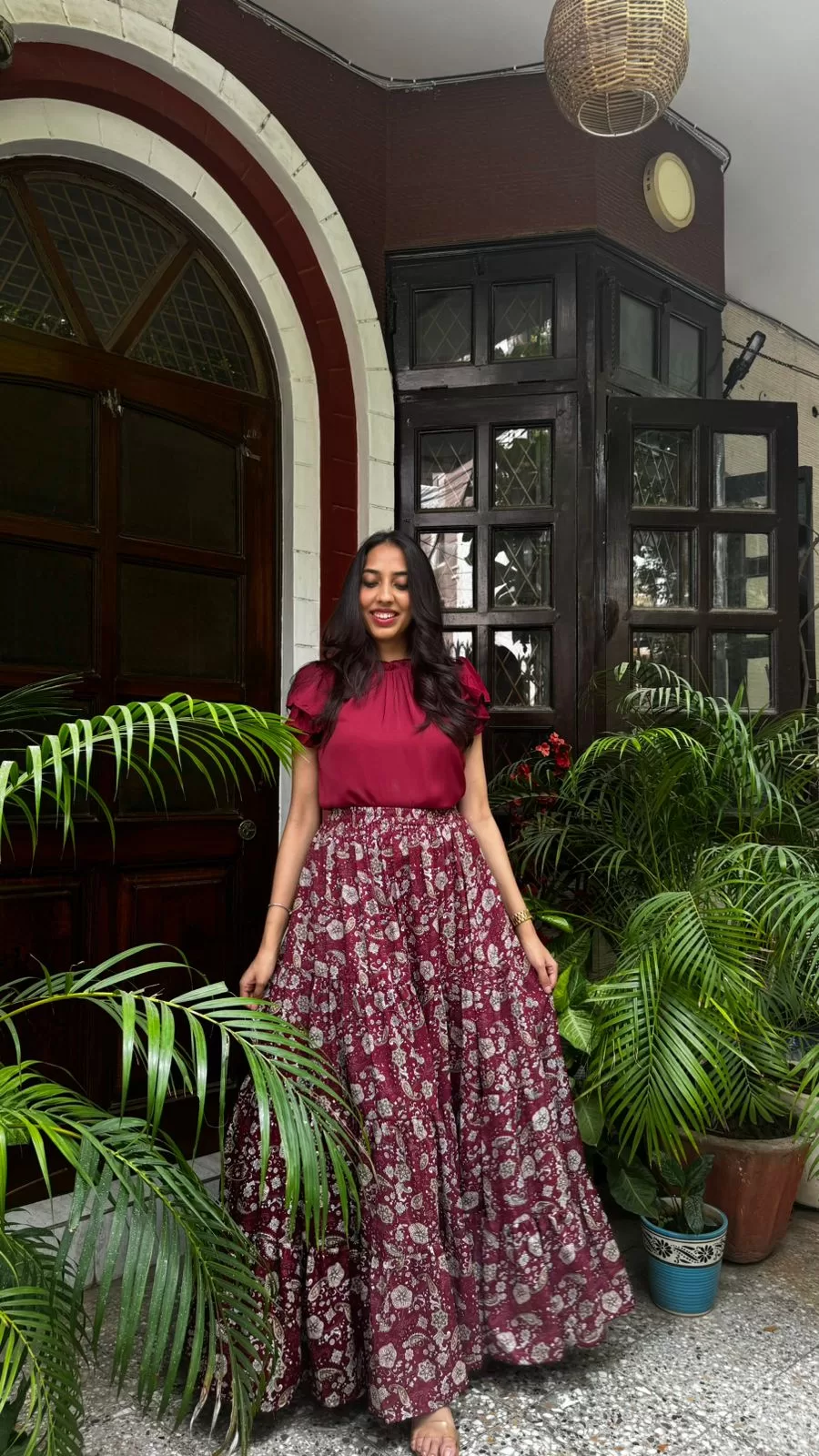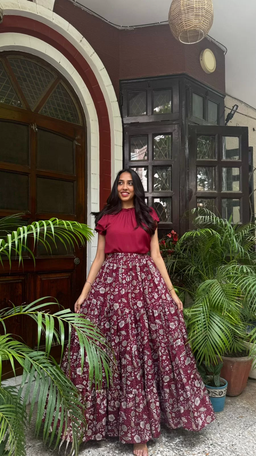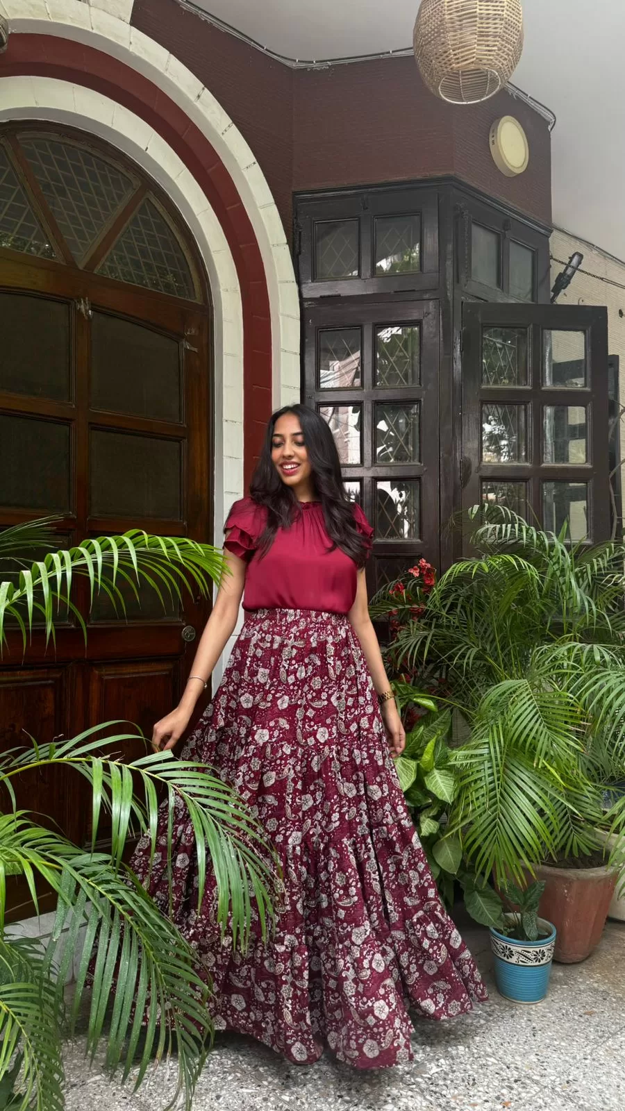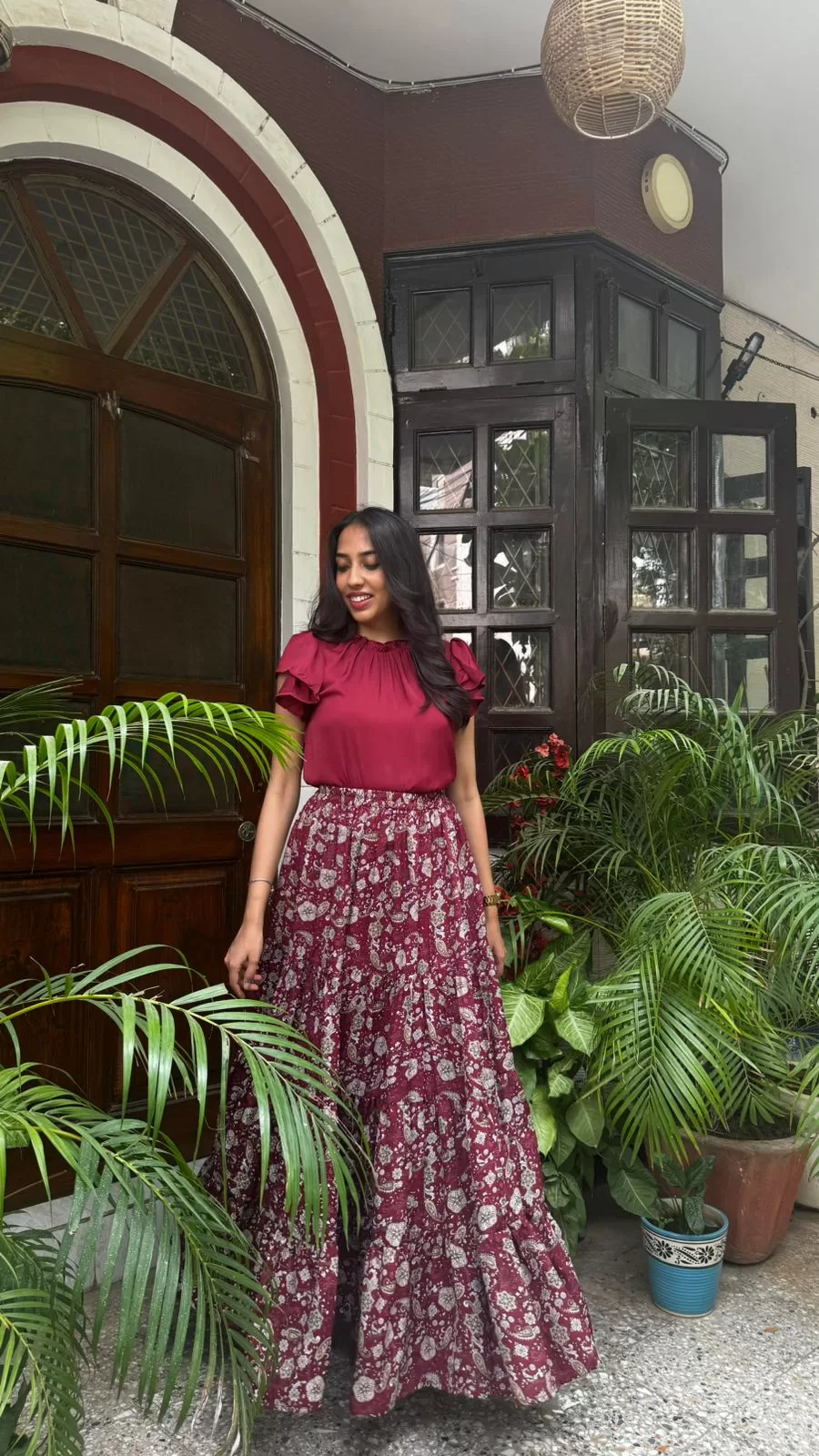 Paired with our Ruffle Satin Top in Maroon. Purchased Separately. Click Here to buy.