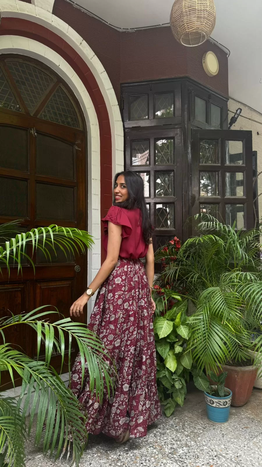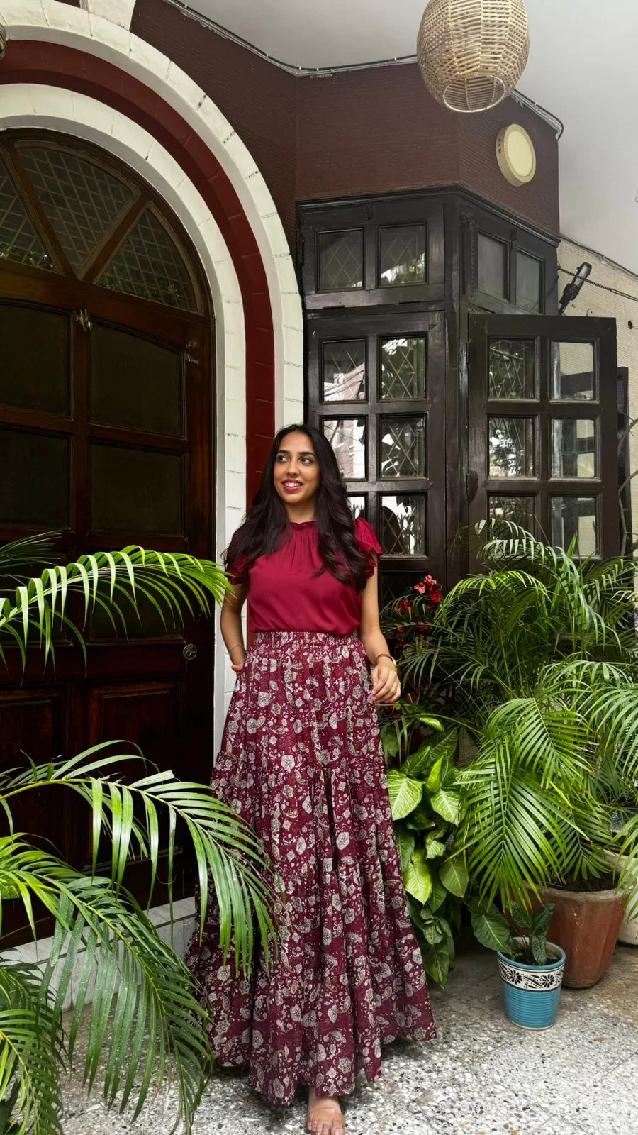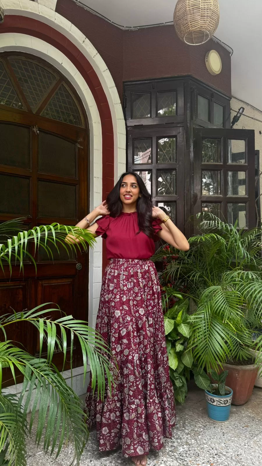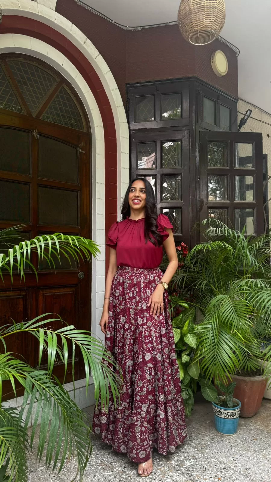 Paired with our Ruffle Satin Top in Maroon. Purchased Separately. Click Here to buy.